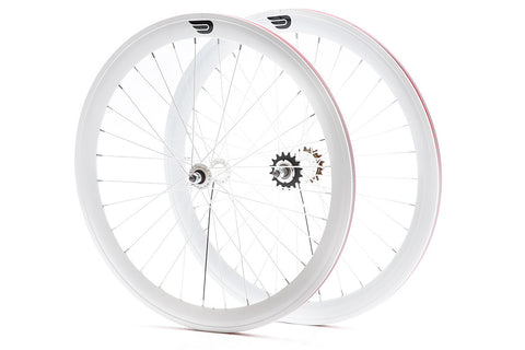Designed for speed and style in a more compact package, these Pure Fix double-walled aluminum wheelsets are size 650C with a 45mm rim depth, front and rear. Our wheels include name-brand and laser-etched, 120 mm KT Quando hubs. Our rear wheels include flip-flop hubs with a pre-attached 16T fixed cog along with a 16T freewheel cog for single-speed riding. Front and rear wheels feature 32 spokes each and all wheelsets include nylon rim-strips to protect against sharp edges and prevent tube puncture.